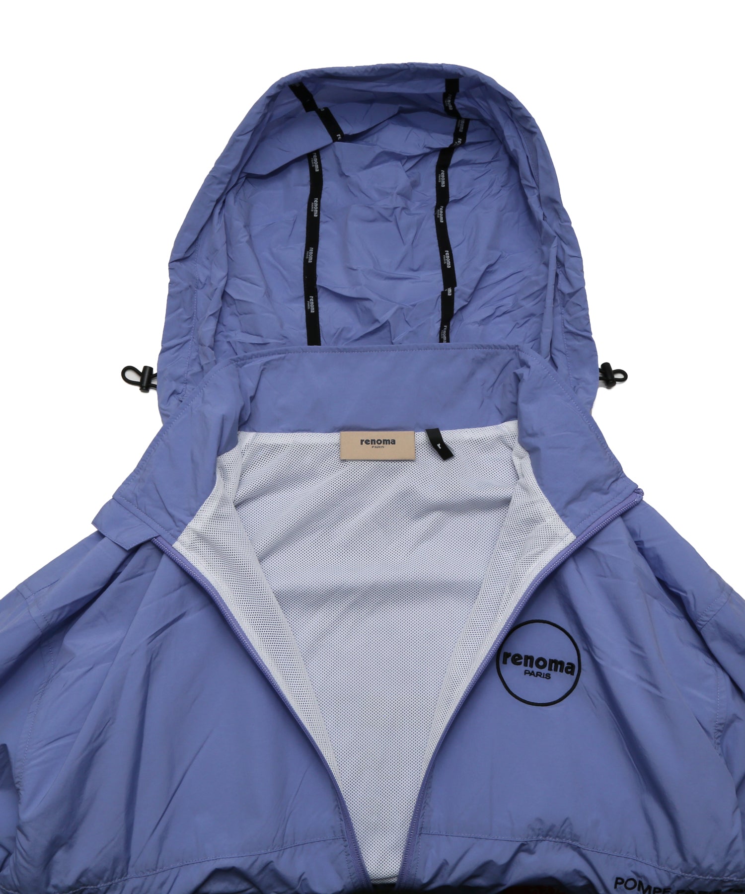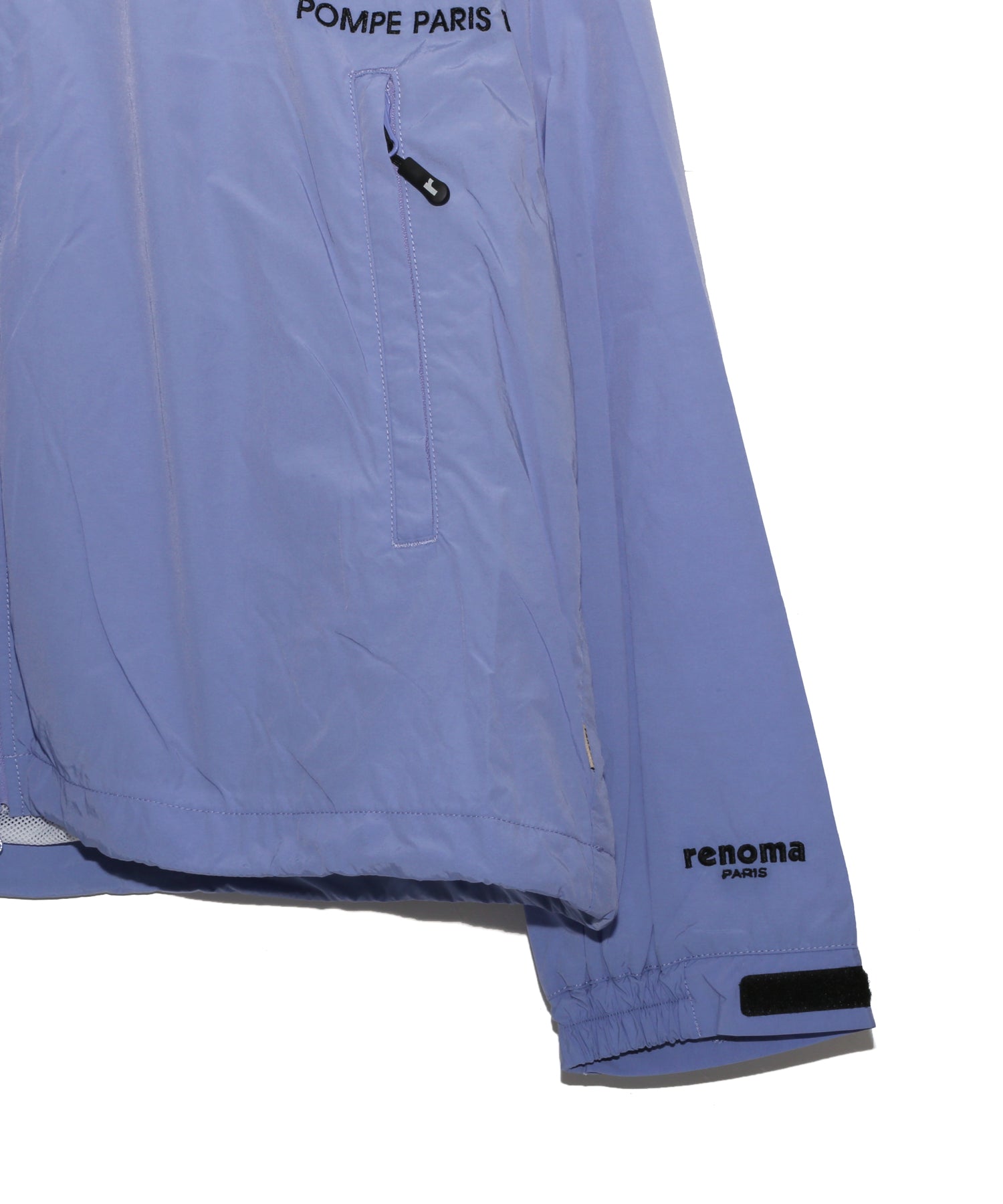 袖口と胸元にはブランドロゴの刺繍を配し、さりげない存在感をプラス。バックにはレノマ本店のアドレスをプリントで施し、後ろ姿まで印象的に仕上げました。