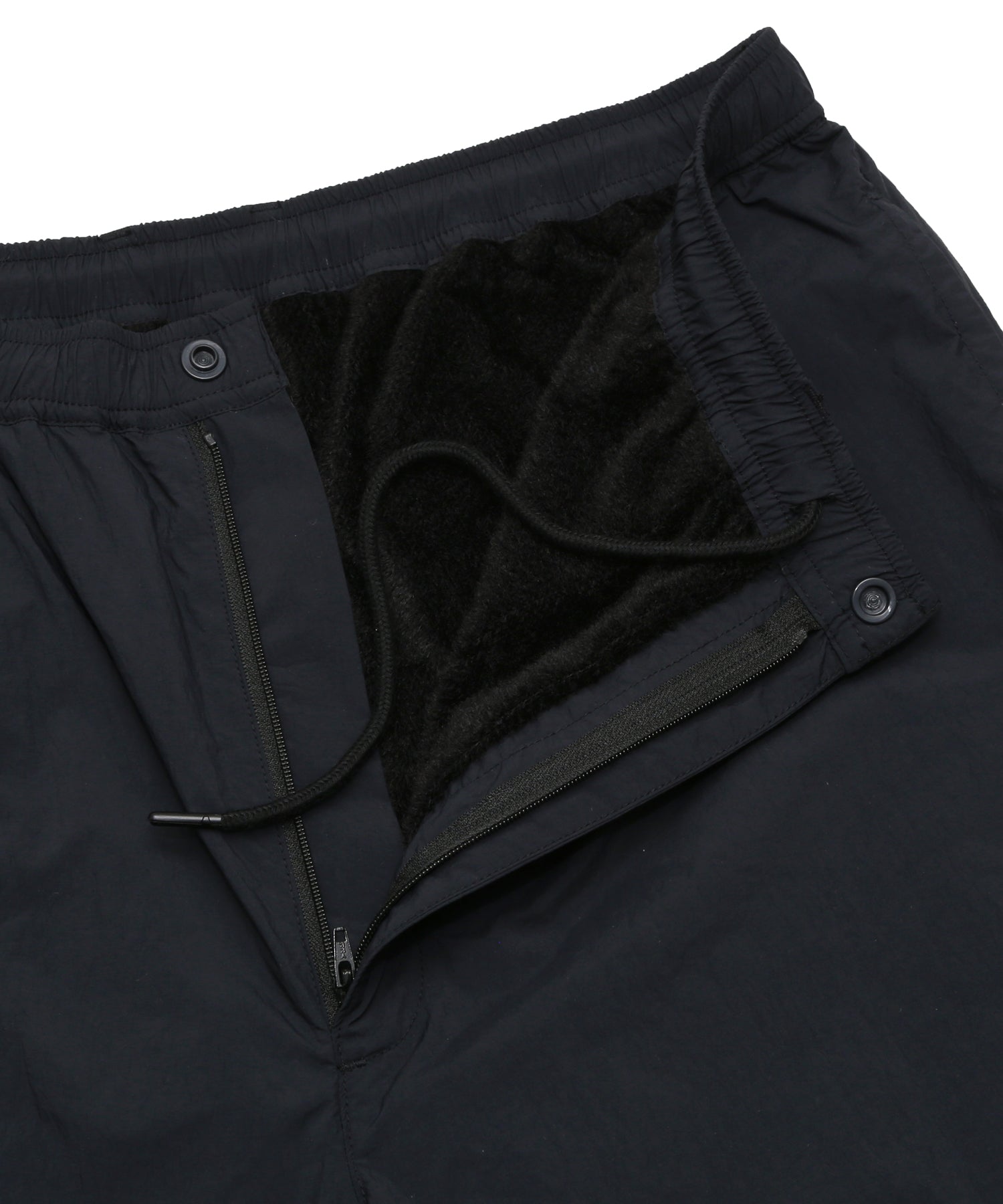 ファスナー付きの前開きに、フルシャーリング仕様のウエスト。ベルトループも備え、実用性と快適さを両立しています。