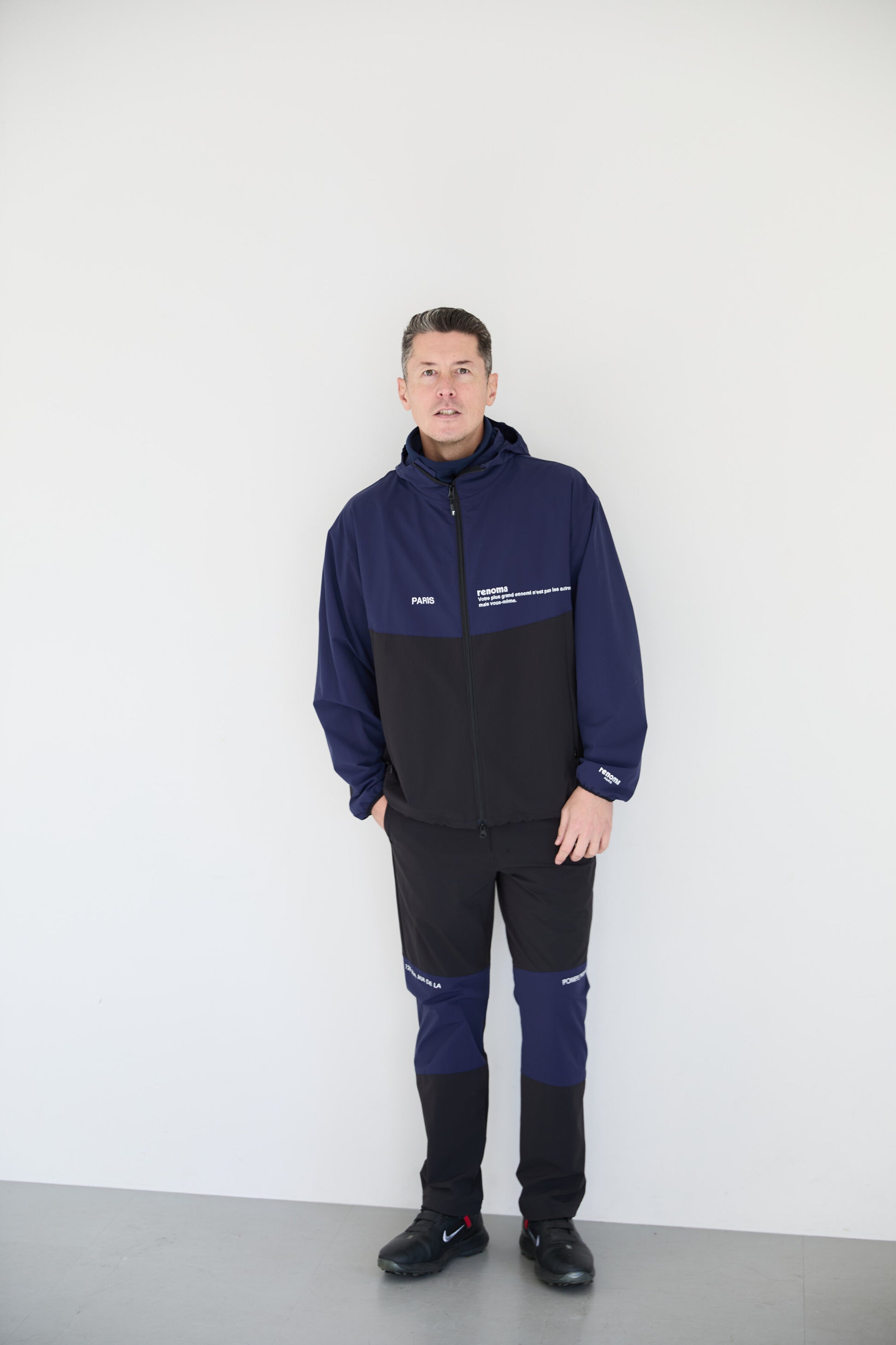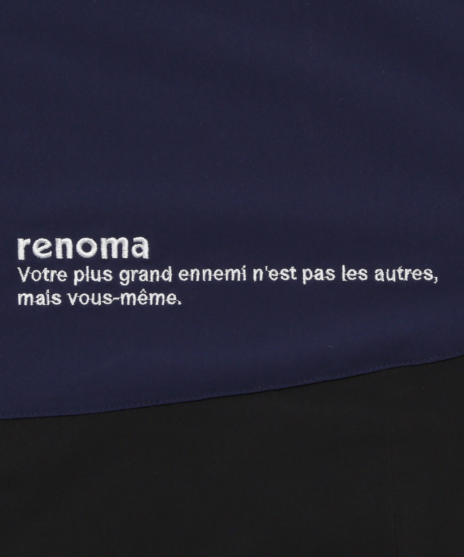 左胸には“Votre plus grand ennemi n’est pas les autres, mais vous-même.”(あなたの最大の敵はあなた自身です)という、Renomaらしい哲学的メッセージを刺繍。